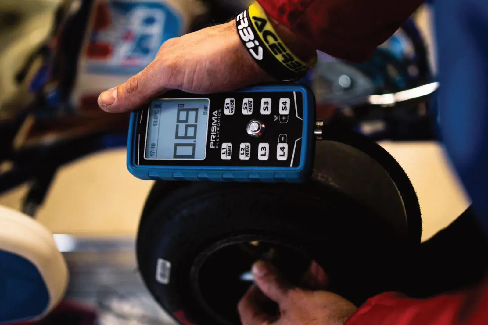 Tyre pressures are your primary tuning tool. Start with 10 PSI cold for medium compound slicks, aiming for a 2-3 PSI rise when hot. Cold mornings or green tracks need higher pressures (12-13 PSI) to generate heat; hot, rubbered surfaces need lower pressures (8-9 PSI) to prevent overheating. In the wet, jump to 20-25 PSI to reduce aquaplaning. Check pressures immediately after every session - this single habit separates quick drivers from also-rans.